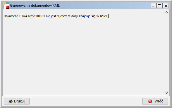 Komunikat pojawia się w momencie, gdy użytkownik próbuje wygenerować plik XML dla dokumentu należącego do rejestru, który nie jest przeznaczony do obsługi w systemie KSeF.
