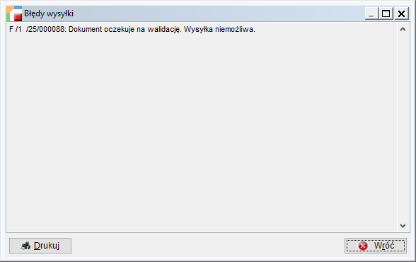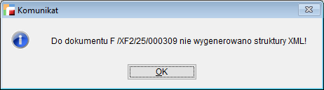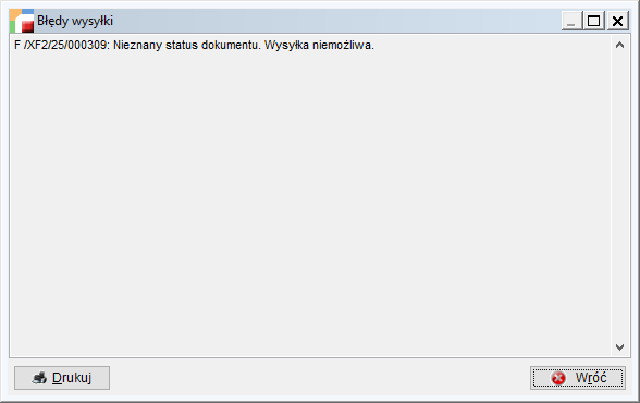 | Błąd wysyłki (brak pliku XML). | Próba wysłania dokumentu, dla którego nie wygenerowano i nie zwalidowano pliku XML. | Należy najpierw użyć opcji Generuj/ Waliduj XML, a następnie ponowić wysyłkę. |