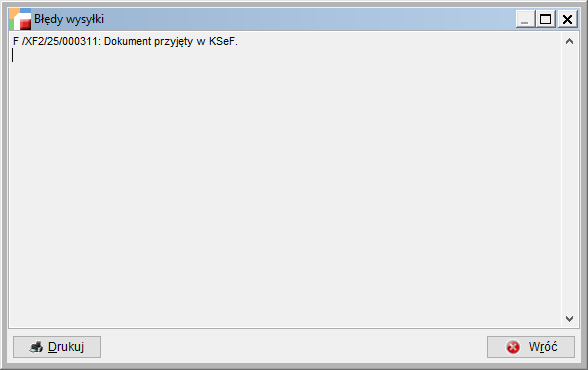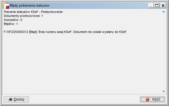 | Dokument przetwarzany przez KSeF. | Próba ponownej wysyłki dokumentu, który ma już status Przetwarzanie. | Należy odczekać i sprawdzić status dokumentu za pomocą opcji Pobierz status, zamiast wysyłać go ponownie. |