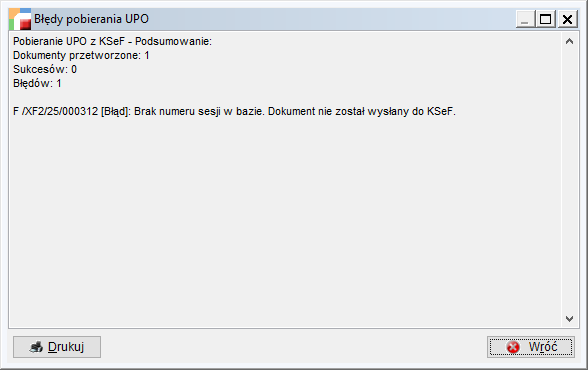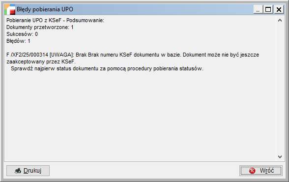 | Błąd pobierania UPO – dokument niezaakceptowany. | Próba pobrania UPO, gdy dokument w KSeF ma status Przetwarzanie i nie został jeszcze ostatecznie zaakceptowany. | 1. Użyć opcji Pobierz status. 2. Jeśli status zmieni się na Przyjęty w KSeF, ponowić próbę pobrania UPO. |