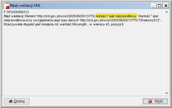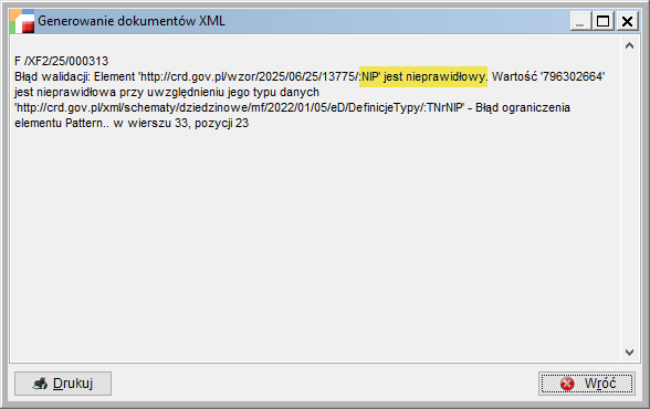 - Walidacja niepoprawna – Wygenerowany plik XML zawiera błędy i nie przeszedł walidacji. Dokument wymaga korekty danych przed ponowną próbą generowania pliku.