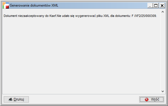 | Próba generowania XML dla dokumentu niezaakceptowanego. | Dokument nie został zaakceptowany do wysyłki (ma status W przygotowaniu). | Należy zaakceptować dokument, a dopiero potem wygenerować dla niego plik XML. |