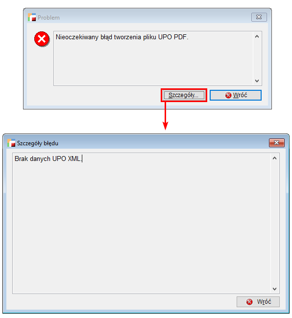 | Brak możliwości podglądu UPO. | Próba podglądu UPO dla dokumentu, dla którego nie zostało ono jeszcze pobrane (kolumna UPO ma wartość NIE). | Należy najpierw pobrać UPO za pomocą opcji Pobierz UPO. |