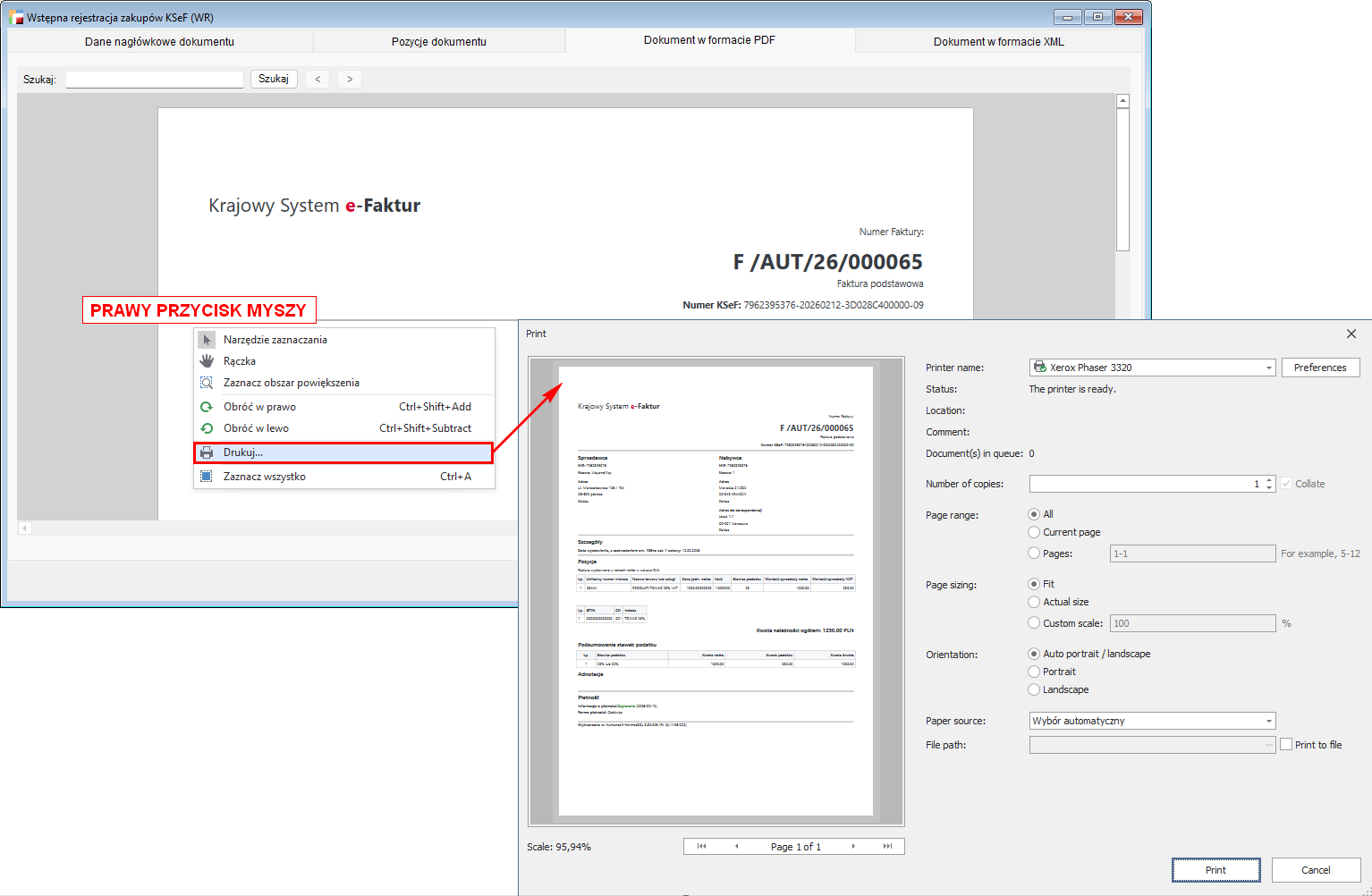Wydruk dokumentu jest możliwy za pośrednictwem menu kontekstowego wyświetlanego po kliknięciu prawym przyciskiem myszy na podglądzie dokumentu w formacie PDF.