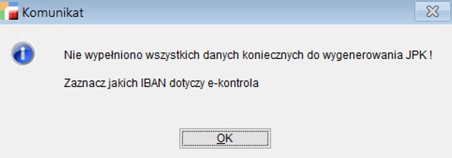 Poprawiono usterkę polegającą na pojawiania się komunikatu: Nie wypełniono wszystkich danych koniecznych do wygenerowania JPK! Zaznacz jakich IBAN dotyczy e-kontrola – pojawiający się podczas próby wygenerowania deklaracji JPK_WB.