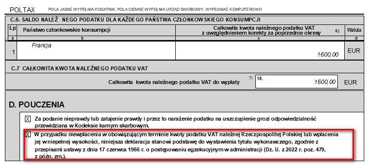 W przypadku niewpłacenia w obowiązujących terminach podatku z poz. 35 lub wpłacenia go w niepełnej wysokości niniejsza deklaracja stanowi podstawę do wystawienia tytułu wykonawczego zgodnie z art. 3a § 1 pkt 1 ustawy z dnia 17 czerwca 1966 r. o postępowaniu egzekucyjnym w administracji (Dz. U. z 2022 r. poz. 479, z późn. zm.). Niniejsza deklaracja stanowi podstawę do wystawienia tytułu wykonawczego również na członka grupy VAT zgodnie z art. 3b § 2 pkt 1 ustawy z dnia 17 czerwca 1966 r. o postępowaniu egzekucyjnym w administracji. *