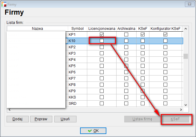 Po ustawieniu się kursorem na firmie licencjonowanej, aktywowany jest przycisk KSeF, za pośrednictwem, którego możliwe jest włączenie wybranego modułu.