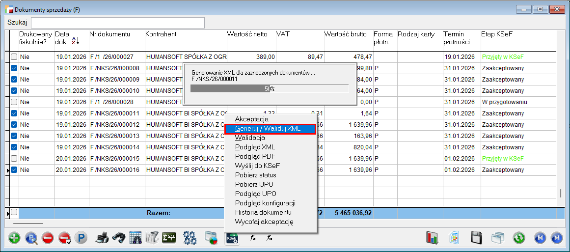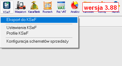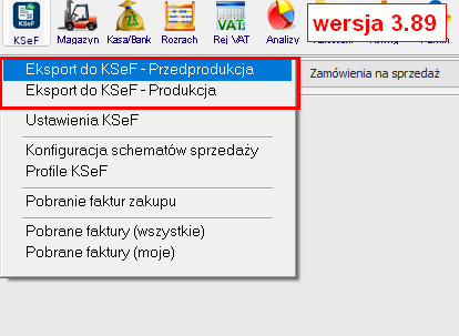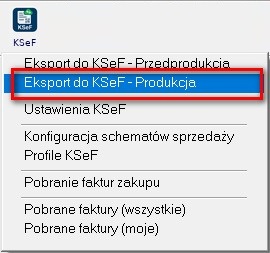 Po przypisaniu Modułu KSeF do firmy, w menu pojawi się opcja umożliwiająca Eksport do KSeF na bramkę produkcyjną.
