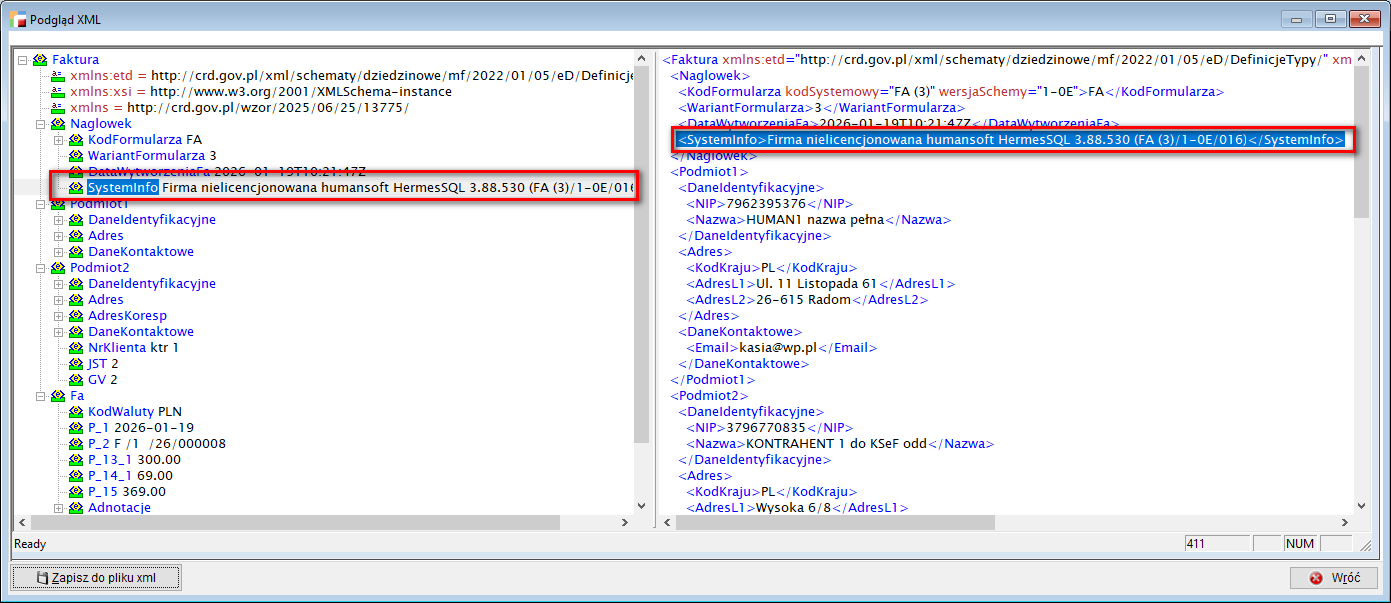 W przypadku firmy nielicencjonowanej, w pliku XML do wygenerowanej faktury, w tagu <SystemInfo> dodana zostanie informacja, że plik powstał z firmy nielicencjonowanej.