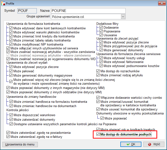 Uprawnienie do pracy z dokumentami poufnymi można nadać użytkownikowi w jego profilu, w zakładce Różne uprawnienia – cd., poprzez zaznaczenie opcji Ma dostęp do dokumentów poufnych. Dzięki temu użytkownik może przeglądać, wystawiać oraz edytować dokumenty oznaczone jako poufne.