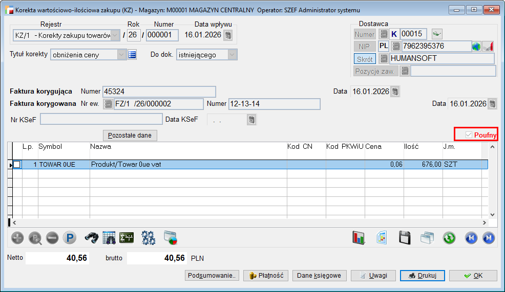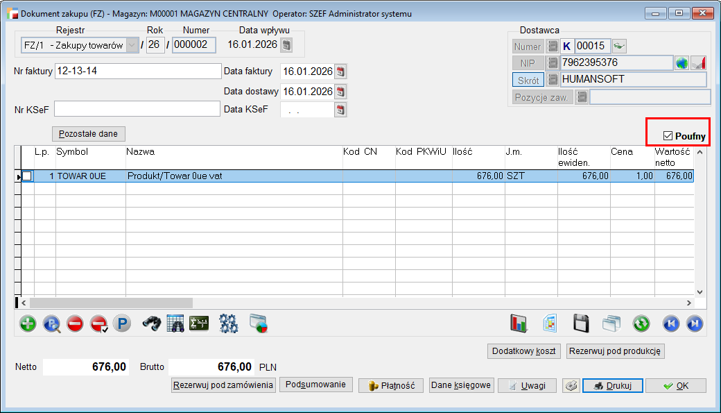 Analogicznie, na formularzach dokumentów F, KF, FZ i KZ dodano znacznik Poufny, który jest dostępny wyłącznie dla użytkowników posiadających odpowiednie uprawnienie.
