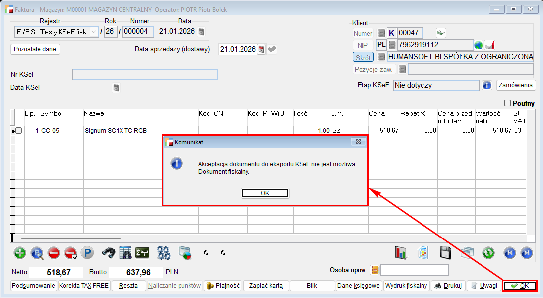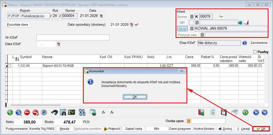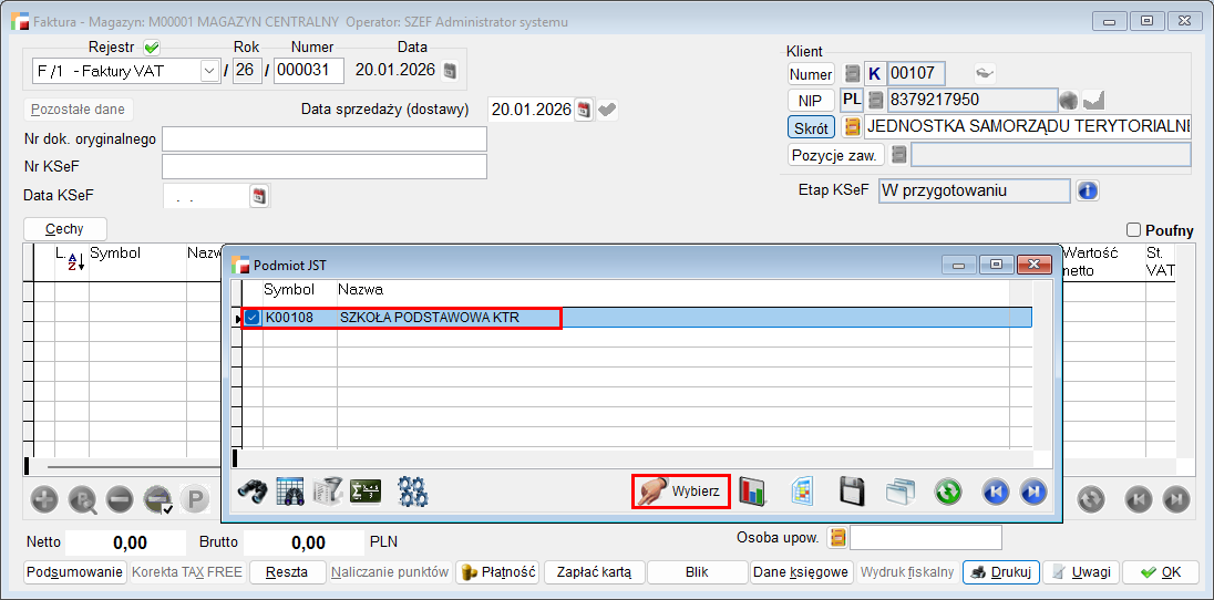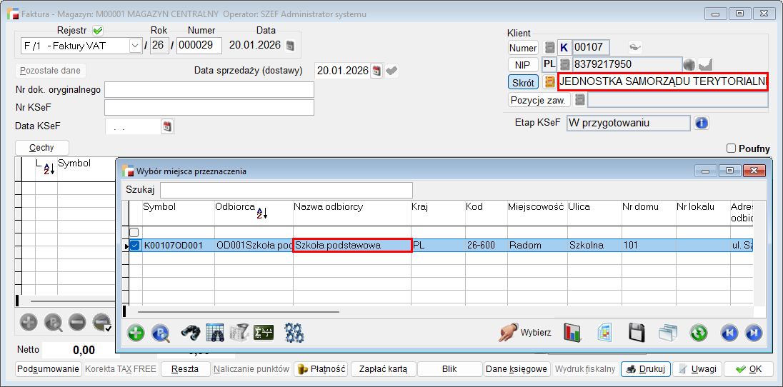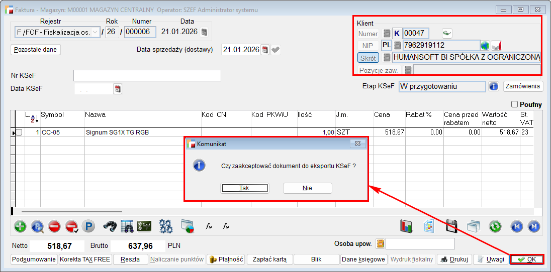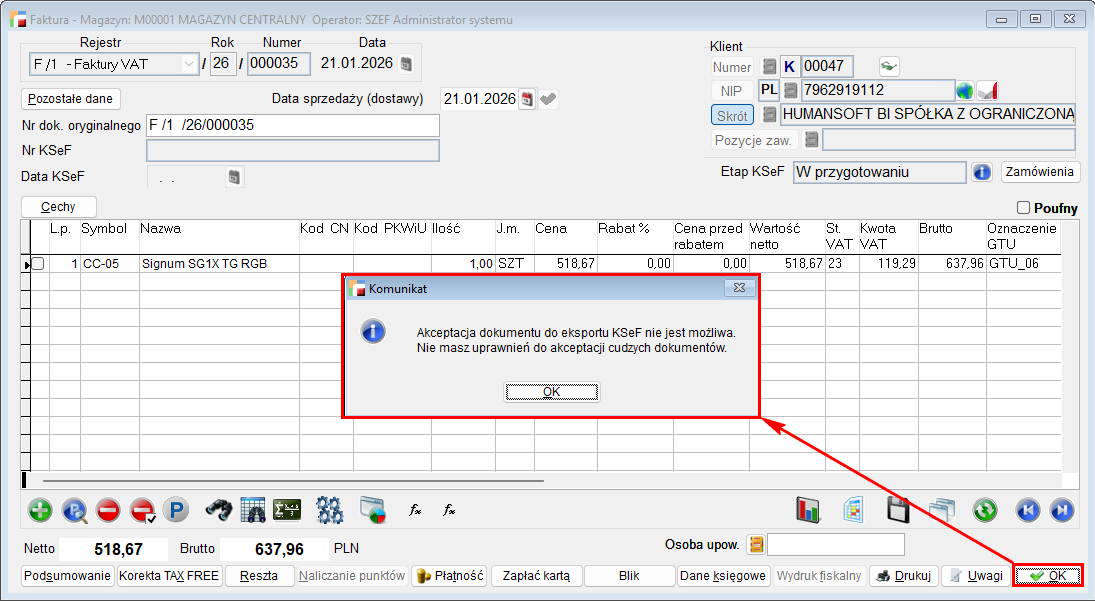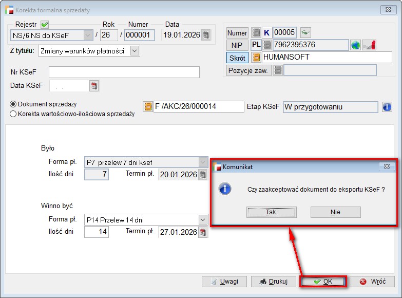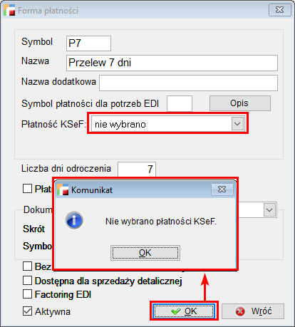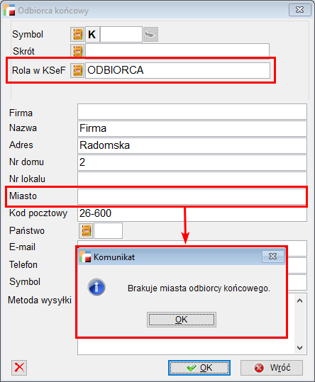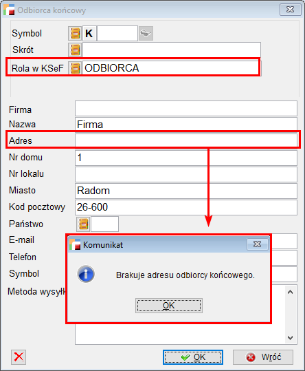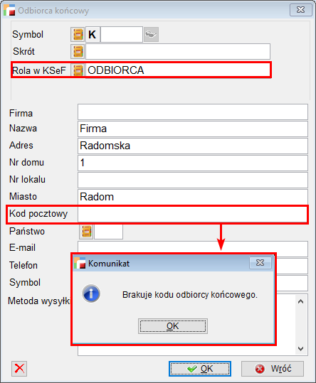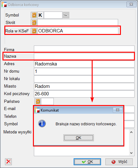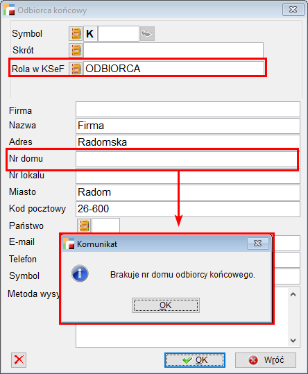 W przypadku braku uzupełnienia któregokolwiek z wymaganych pól, system nie pozwoli na zatwierdzenie okna. Wynika to z wymagań walidacyjnych KSeF a brak jednej z tych danych spowoduje błędy walidacji.