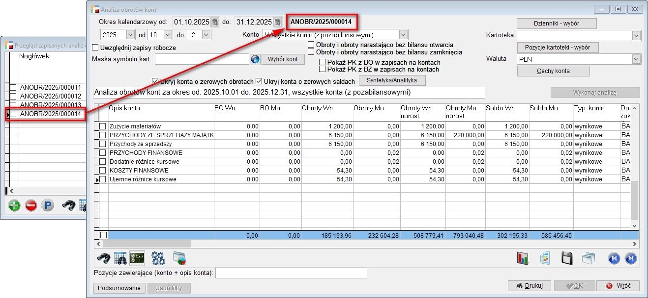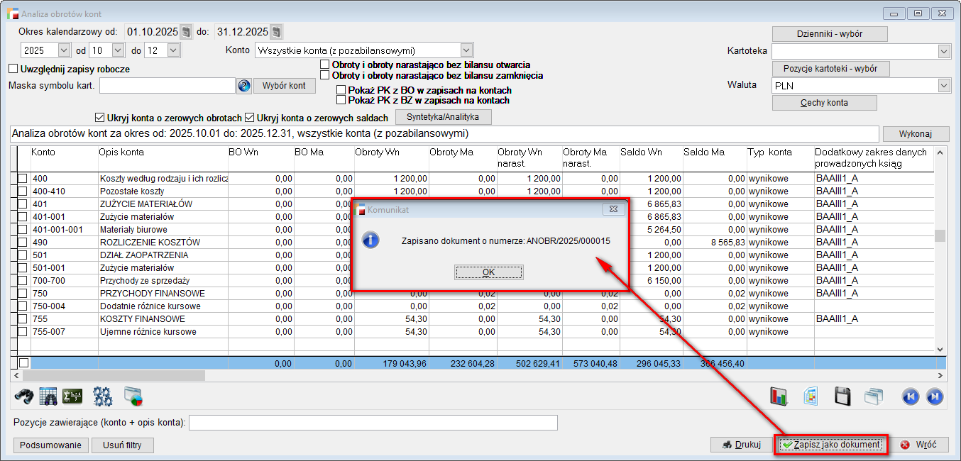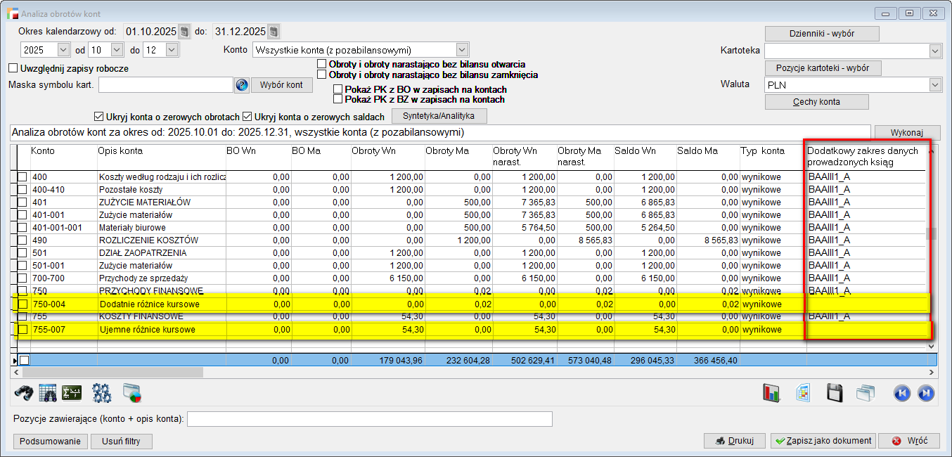 Aby prawidłowo wygenerować dedykowany plik dla jednostek stosujących MSSF, należy wykonać Analizę obrotów kont i ją zapisać. W takim przypadku konta nie muszą mieć przypisanych znaczników kont z dodatkowego zakresu danych.