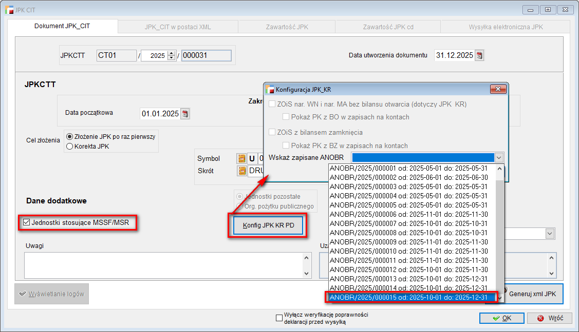 Następnie należy zaznaczyć dedykowaną opcję Jednostki stosujące MSSF/ MSR przy tworzeniu nowego dokumentu JPK_CIT i wskazać przygotowaną analizę obrotów.