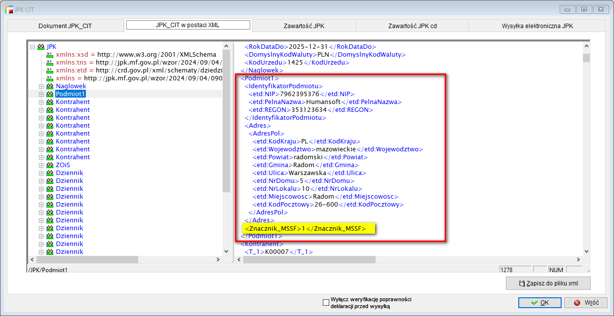 Po wygenerowaniu pliku, w XML’u widoczny będzie Znacznik_MSSF w sekcji Podmiot1.