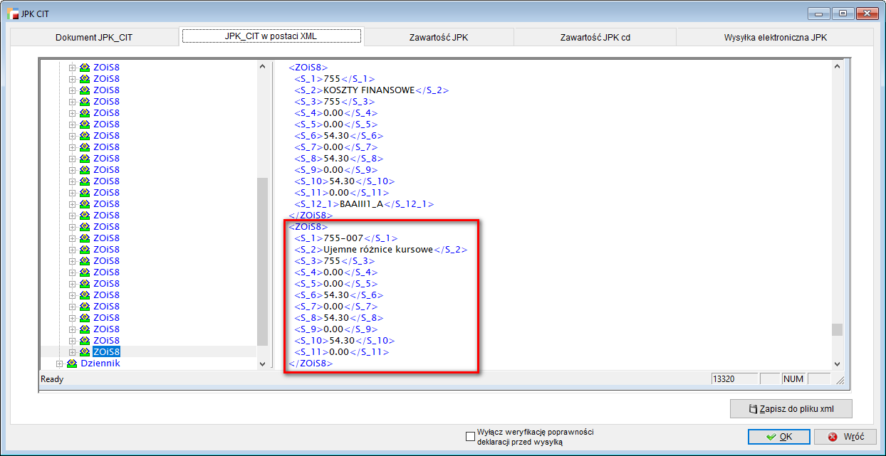Natomiast węzły dotyczące zestawienia obrotów i sald będą ocechowane jako ZOiS8 bez wymagalności dodatkowych znaczników kont.