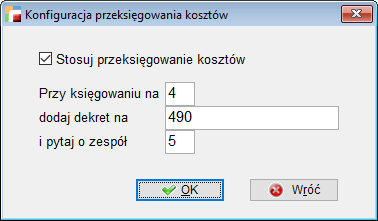 Opisywane zagadnienie dotyczy włączonej w menu Księgi Handlowej konfiguracji dotyczącej kręgu kosztów, pozwalającej na automatyczne zaksięgowanie na konto 4, 490 oraz przypisanego do transakcji konta zespołu 5.