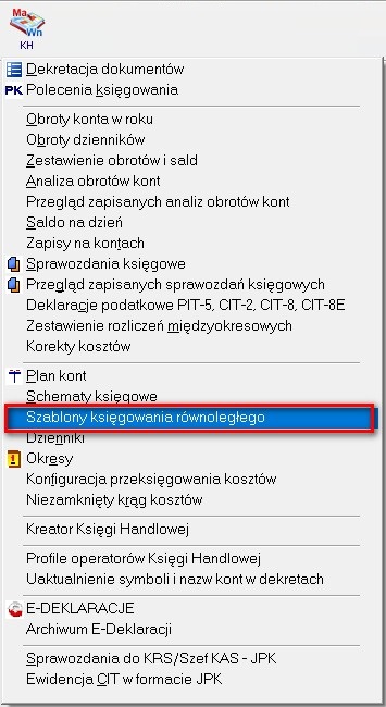 W związku z powyższym, w menu Księga Handlowa pod schematami księgowymi, dodano opcję Szablony księgowania równoległego.