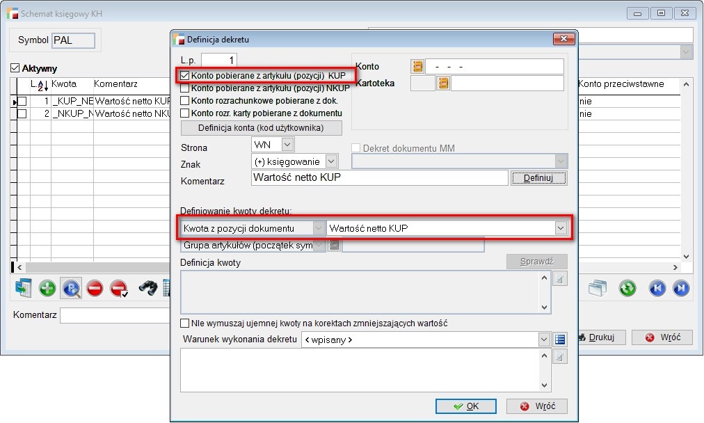 Mechanizm działa analogicznie do definicji kwoty w schemacie księgowym dla księgowania z pozycji dokumentu.