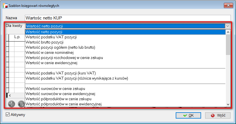 Zakładka Przeksięgowania umożliwia także ręczne dodanie dekretów. W pierwszej kolejności należy wskazać kwotę z pozycji dokumentu, analogicznie jak w definicji szablonu księgowania równoległego.