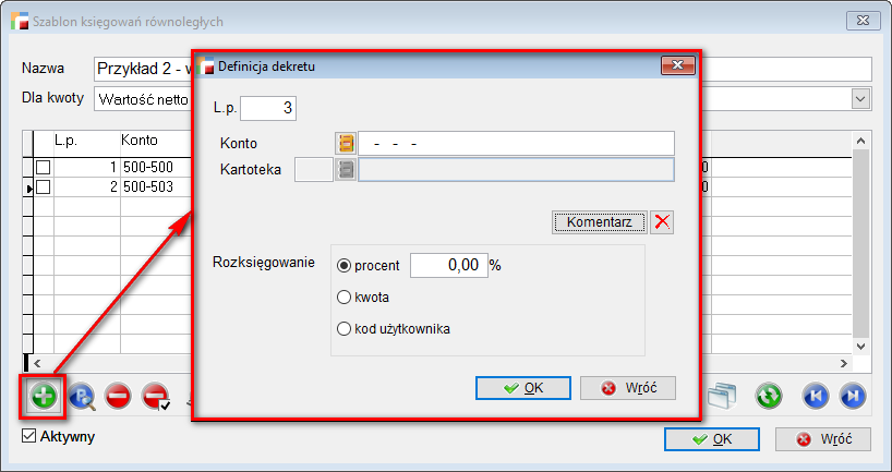 Tworząc nowy szablon należy podać kwotę z pozycji dokumentu, która będzie przeksięgowana oraz szereg definicji dekretów na piątki.