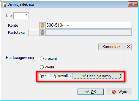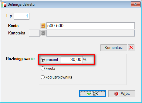 Przy definiowaniu pozycji dekretu należy podać konto, jak również można wprowadzić komentarz treść dekretu.