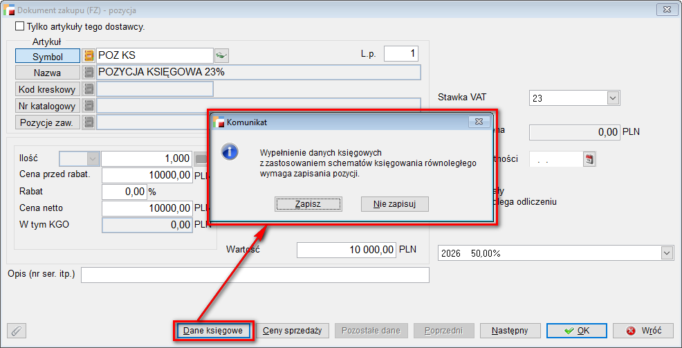 Jeżeli operator nie zgodzi się na zapisanie dodawanej pozycji, wyświetlony zostanie dotychczasowy formularz danych księgowych.