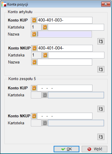 zespołu 5. Ostatnie wersje wprowadziły ułatwienia, ponieważ możliwe jest wskazanie konta zespołu 5 w kartotece artykułu, natomiast nadal problemem było księgowanie jednego konta zespołu 4 i wielu kont zespołu 5.