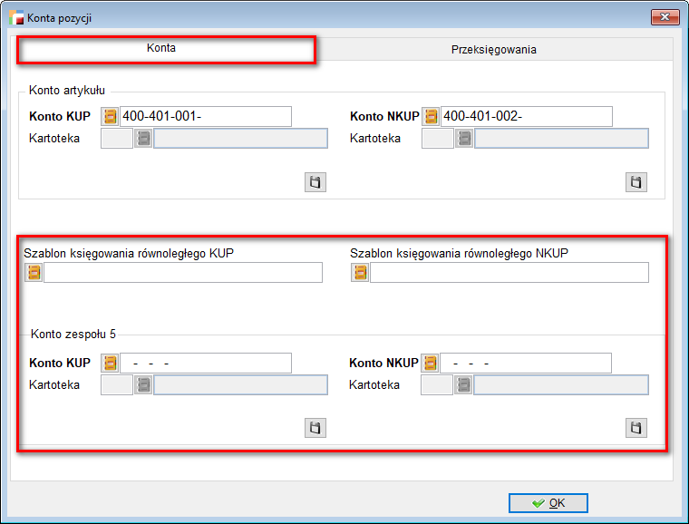 Na zakładce Konta, po wyborze konta KUP i NKUP z zespołu KUP można użyć szablonu księgowania równoległego lub możliwe jest wskazanie odpowiednich kont zespołu 5, tak jak to miało miejsce dotychczas. Oznacza to, że można dodać dekrety bez wykorzystania szablonu księgowania równoległego.