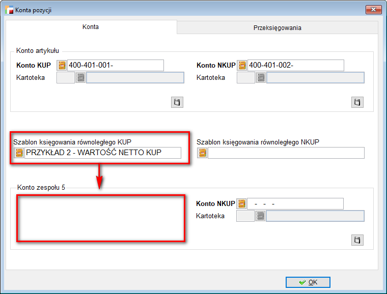Wskazanie szablonu księgowania równoległego będzie skutkowało brakiem możliwości wskazania jednego konta zespołu 5.