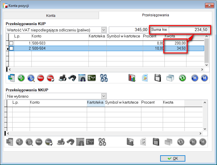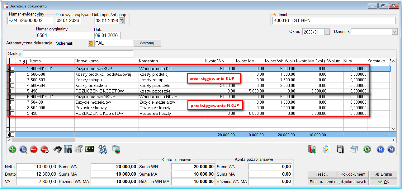Program wyświetla też sumę kwot dekretów dla przeksięgowań KUP i NKUP.