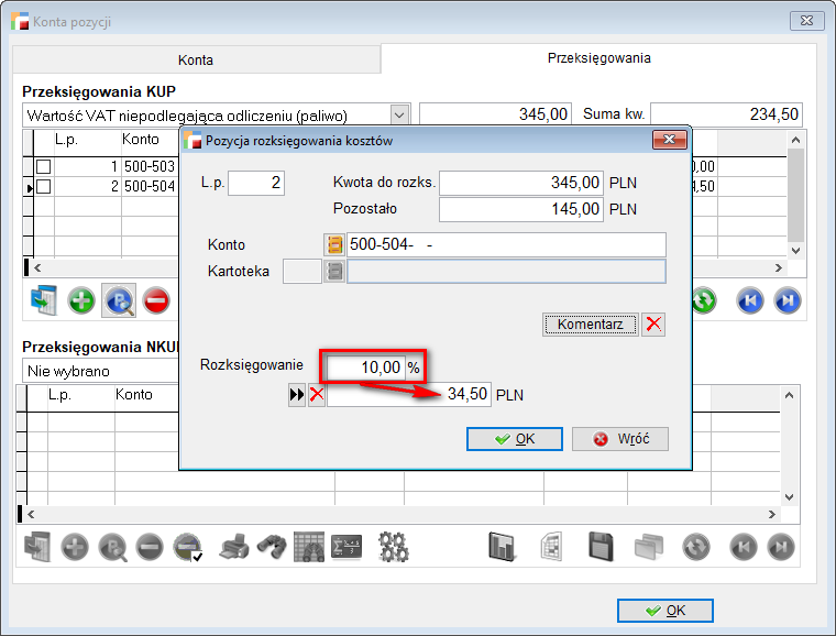 Dodając pozycję po wybraniu konta należy podać jej kwotę. Może zostać obliczona jako procent od kwoty pobranej z pozycji dokumentu lub wpisana ręcznie.