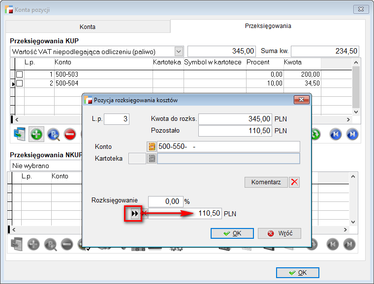 Nowa opcja umożliwia zdefiniowanie przeksięgowania kosztów wynikających z faktury zakupu z czwórek na wiele piątek.