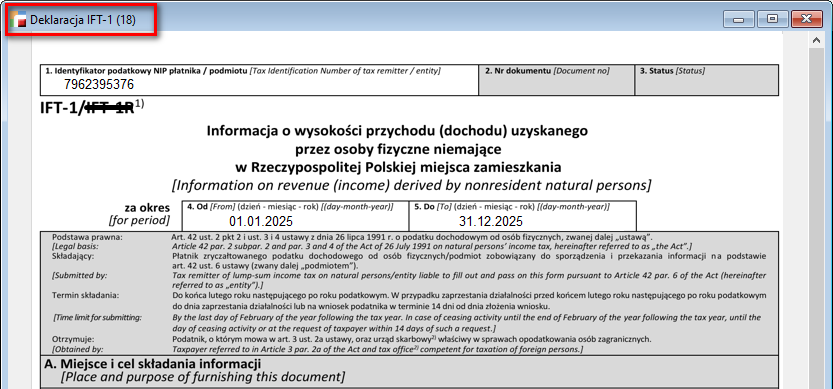 Dodano obsługę nowych formularzy deklaracji IFT-1 oraz IFT-1R – Informacja o wysokości dochodu (przychodu), uzyskanego w Polsce przez osoby, które w naszym kraju nie mają miejsca zamieszkania, w wersji 18.