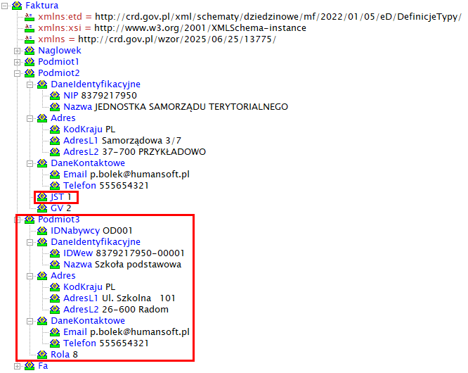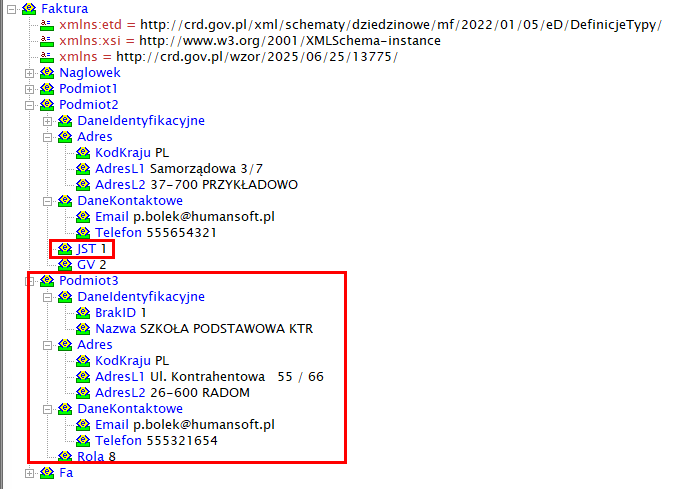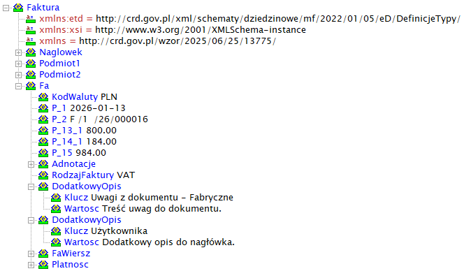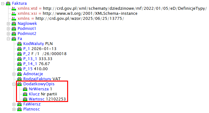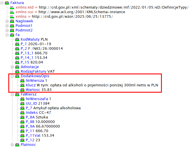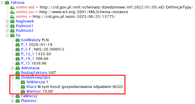 W efekcie w wygenerowanym XML’u dla dokumentu F /NKS/26/000013 w węźle Fa znajduje się gałąź DodatkowyOpis zawierająca tagi:
