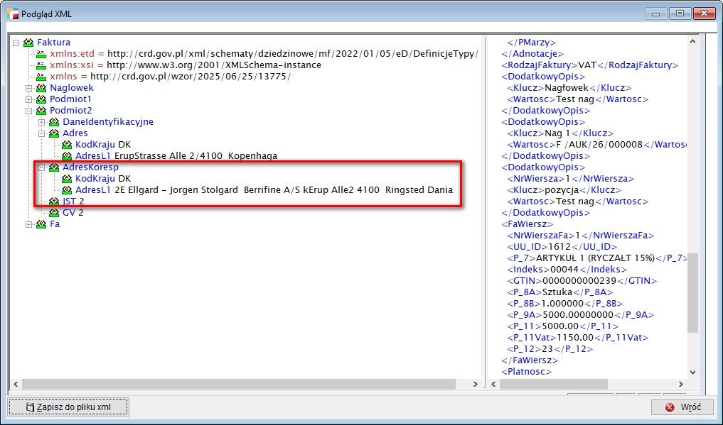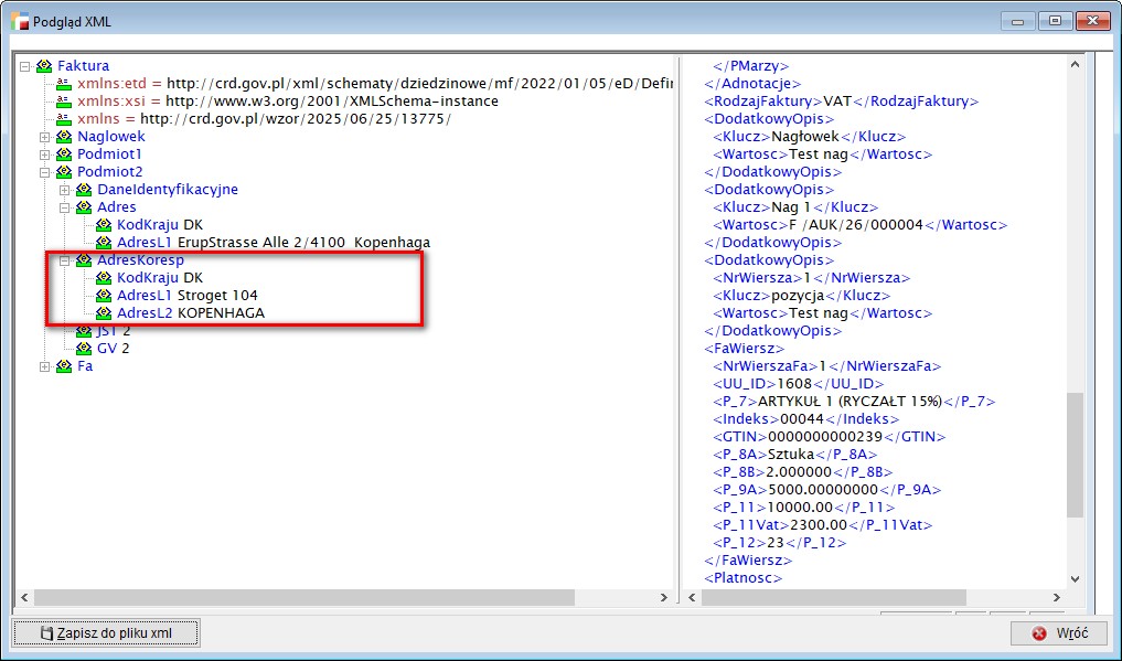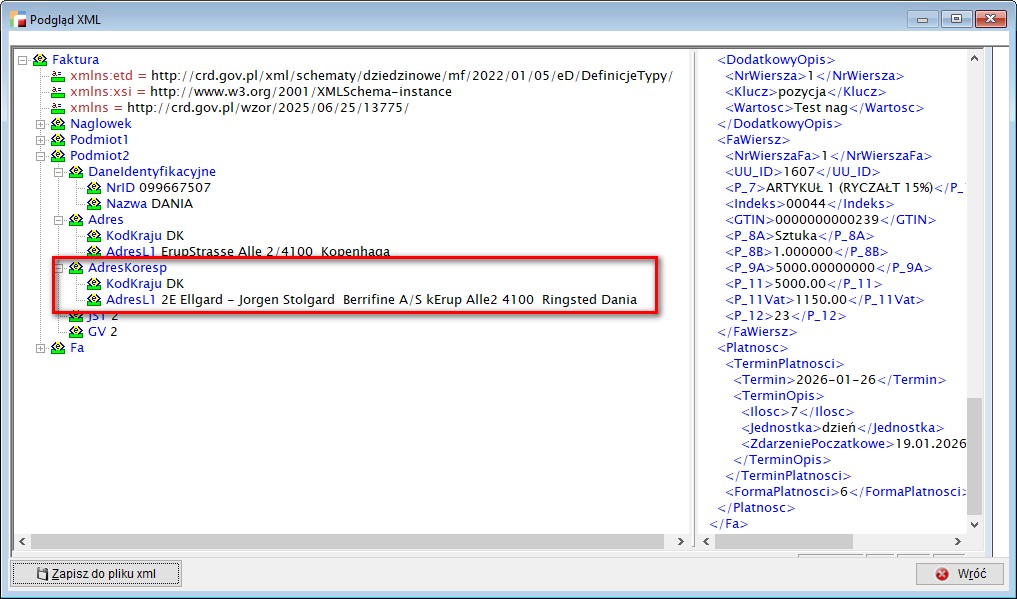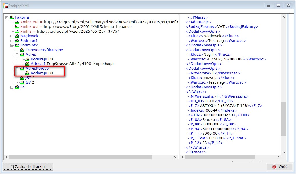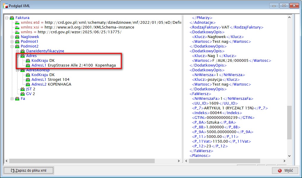 W efekcie w wygenerowanym XML’u dla dokumentu F /NKS/26/000009 w węźle Fa znajduje się gałąź DodatkowyOpis zawierająca tagi: