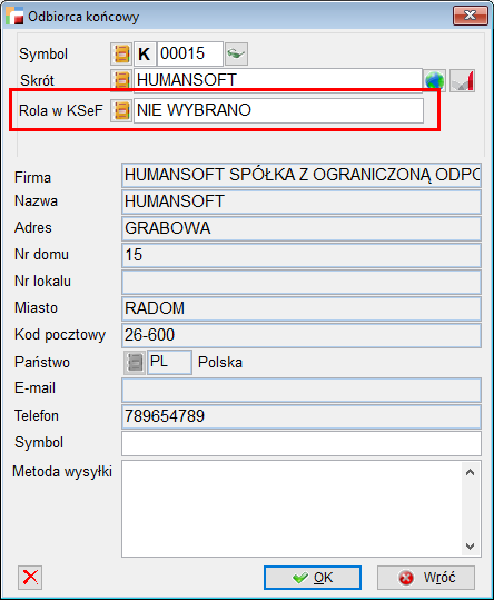Dodatkowo, w przypadku przypisania roli odbiorcy końcowego, obowiązkowe jest uzupełnienie następujących danych: