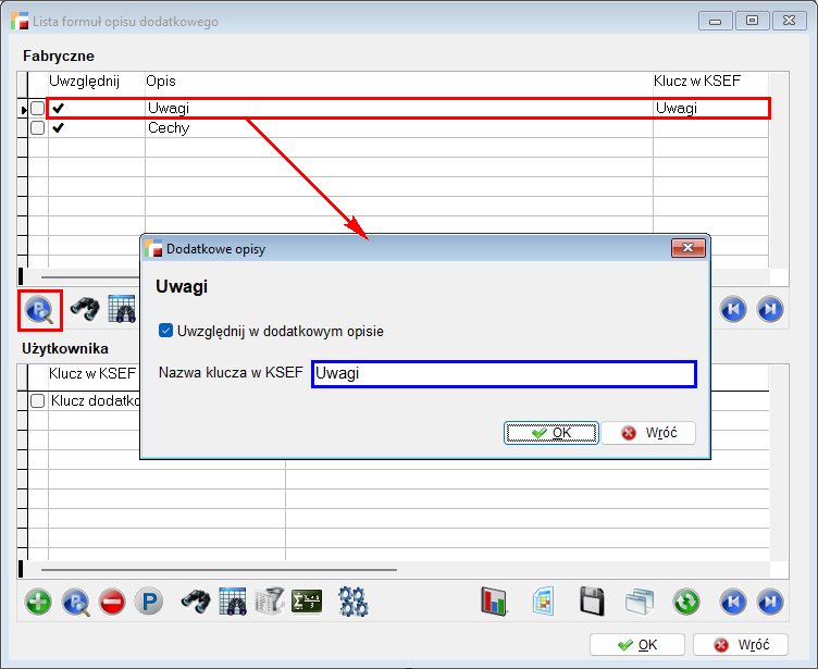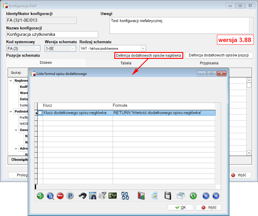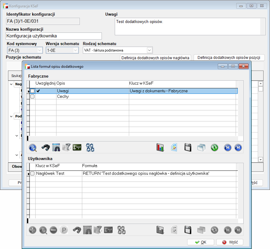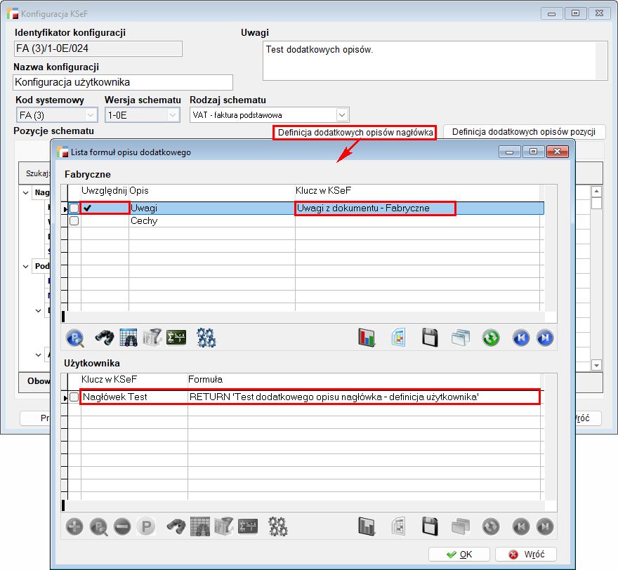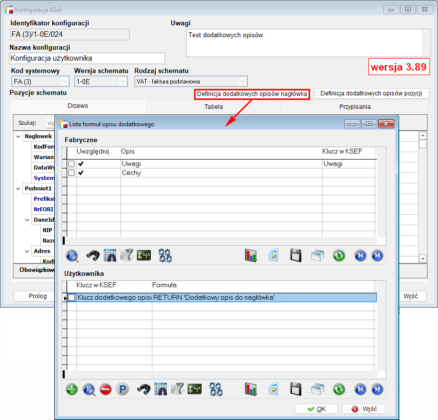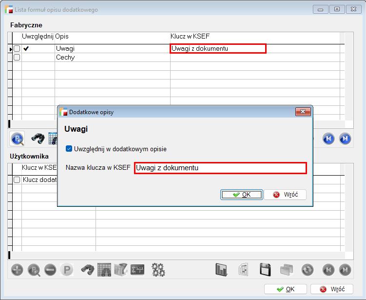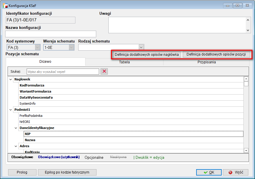 - <Klucz> zawierający nazwę klucza w KSeF tj. domyślnie Opis do pozycji,