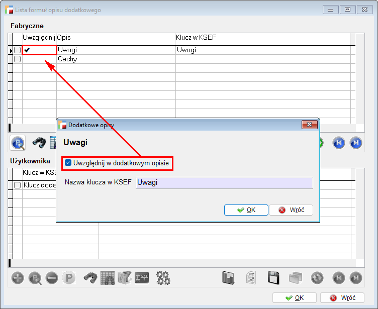 Po zatwierdzeniu zmian pozycja ta zostanie oznaczona na liście dodatkowych opisów w kolumnie Uwzględnij, co oznacza jej udział w schemacie.