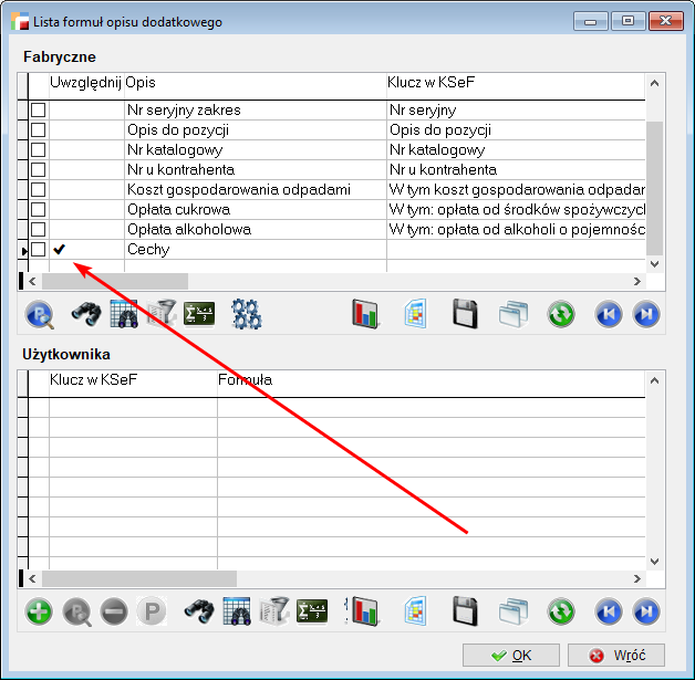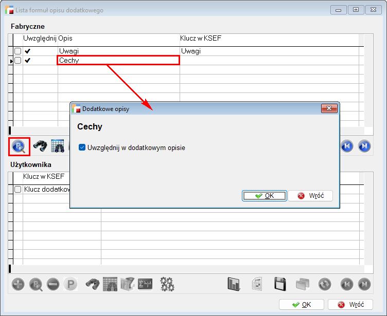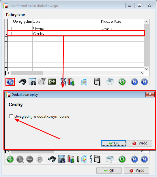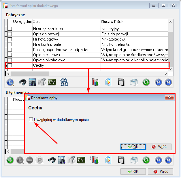 Aby uwzględnić cechy w dodatkowych opisach, należy w konfiguracji dodatkowych opisów odnaleźć pozycję Cechy, wejść w jej edycję i zaznaczyć opcję Uwzględnij w dodatkowym opisie.