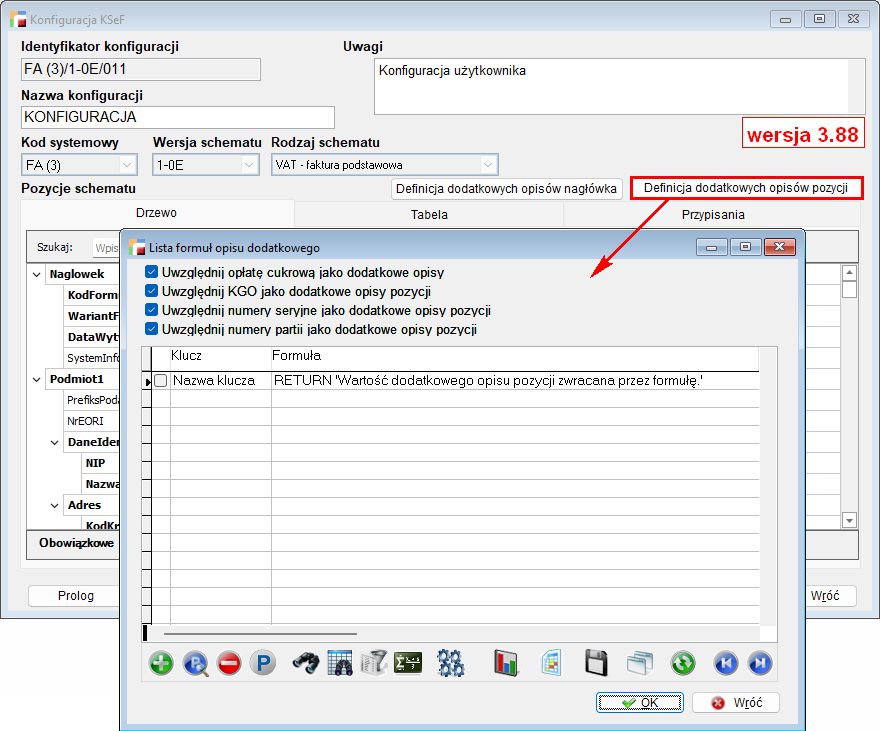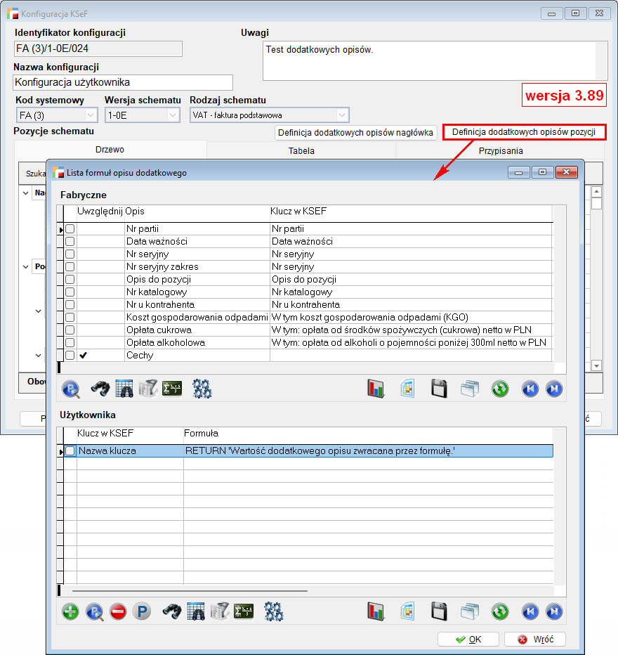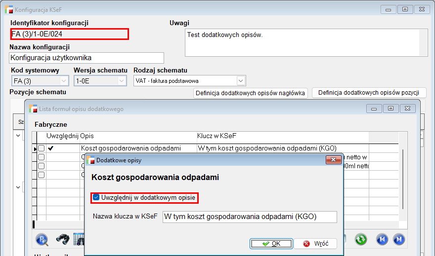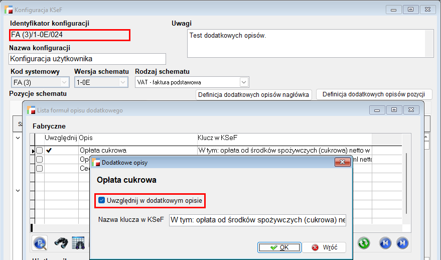 Wskazana konfiguracja KSeF posiada włączone uwzględnianie Opłaty cukrowej w dodatkowym opisie w Definicji dodatkowych opisów pozycji.