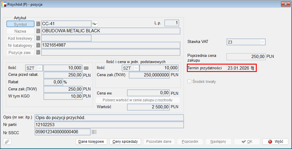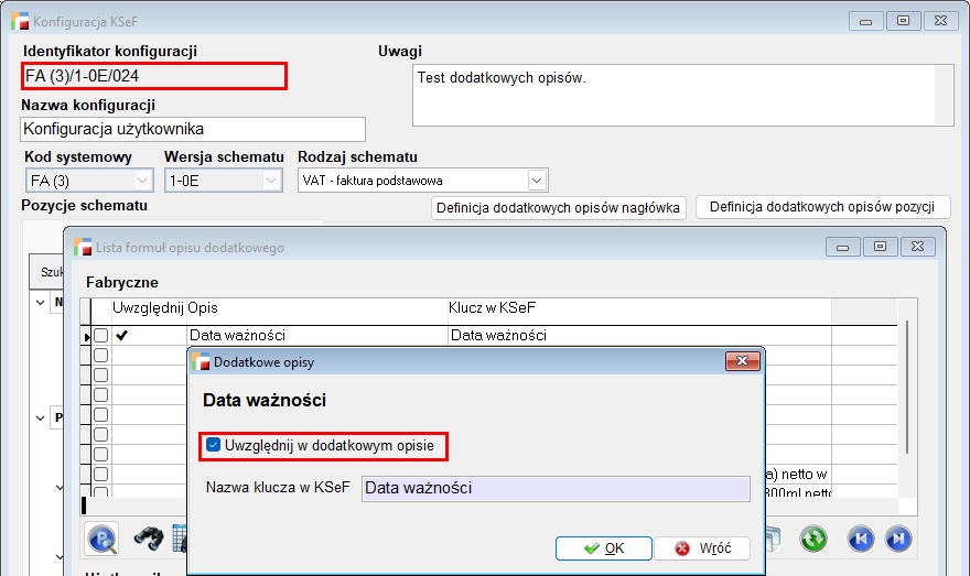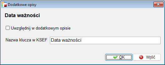 Wskazana konfiguracja ma włączone uwzględnianie Daty ważności w dodatkowym opisie w Definicji dodatkowych opisów pozycji.