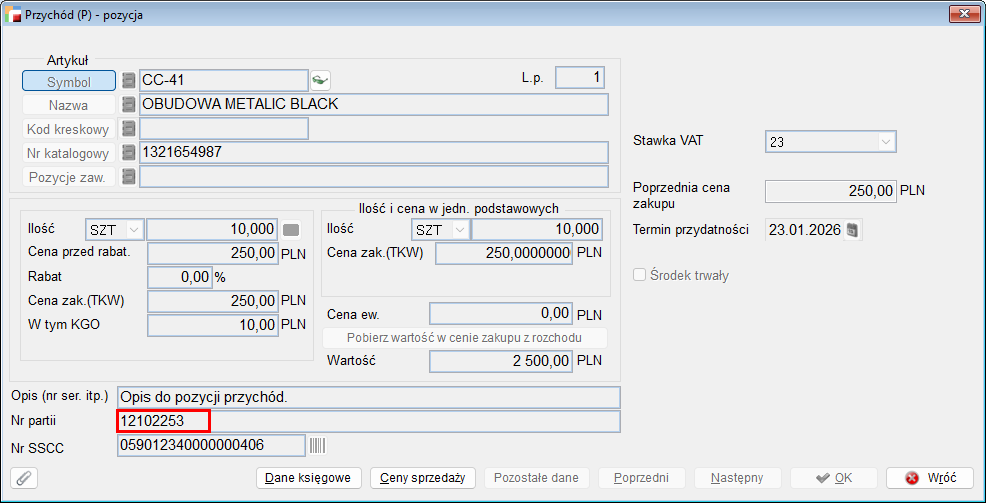 - <Wartosc>, do którego wpisywany jest nr partii z dokumentu przychodowego.