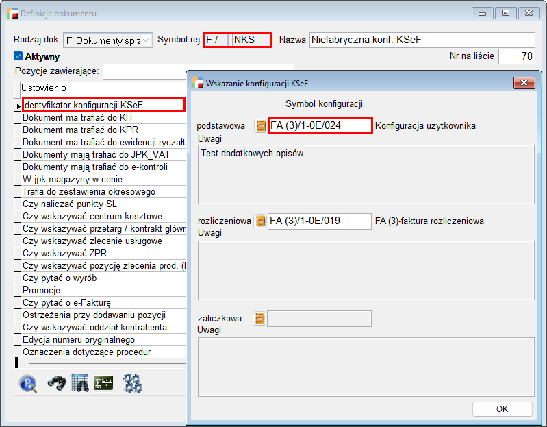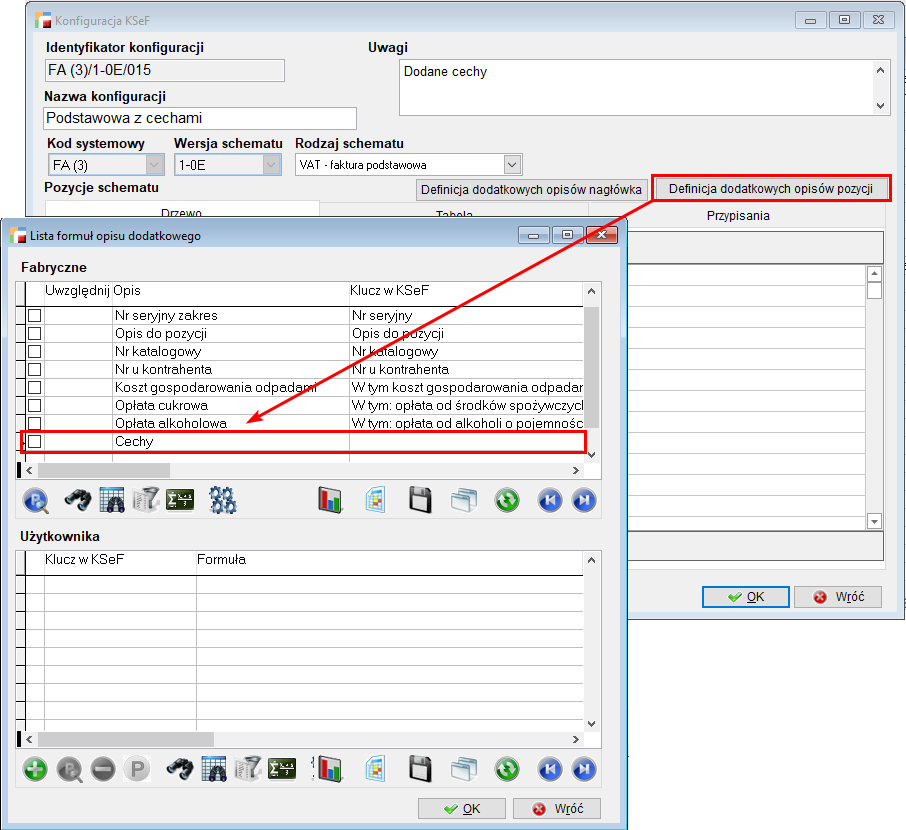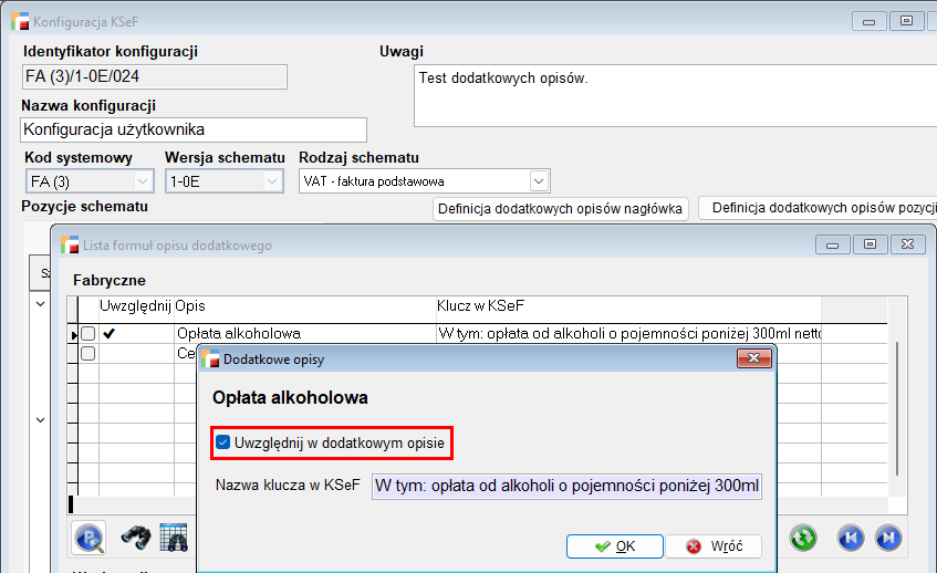 Wskazana konfiguracja KSeF posiada włączone uwzględnianie Opłaty alkoholowej w dodatkowym opisie w Definicji dodatkowych opisów pozycji.