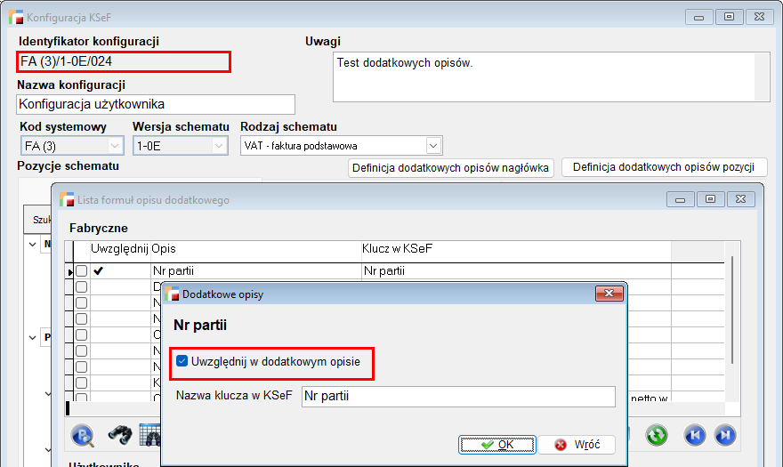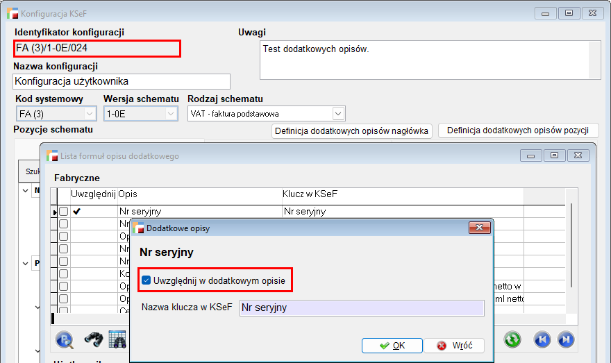 Wskazana konfiguracja ma włączone uwzględnianie Nr seryjnego w dodatkowym opisie w Definicji dodatkowych opisów pozycji.