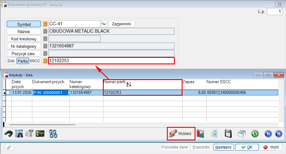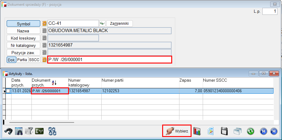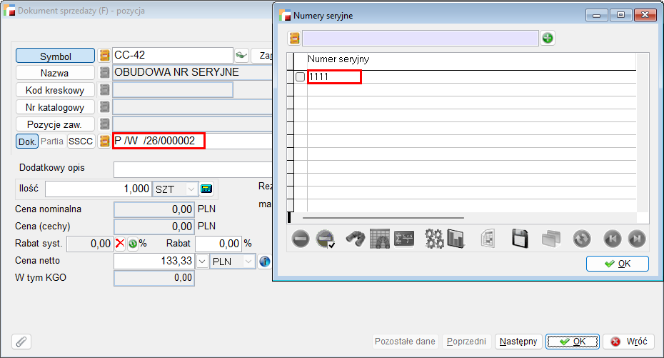 Podczas dodawania pozycji na dokumencie sprzedaży F /NKS/26/00007, pozycja sprzedaży została powiązana z konkretną dostawą, tj. pozycją dokumentu P /W /26/000002 oraz wskazany został konkretny nr seryjny dla wydawanej pozycji tj. 1111.