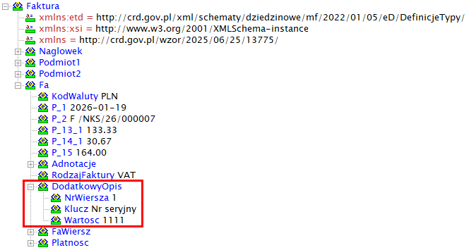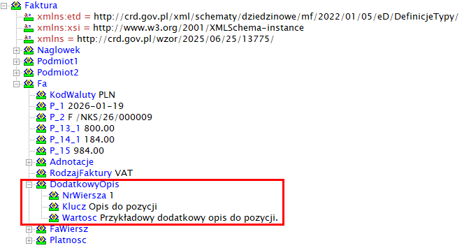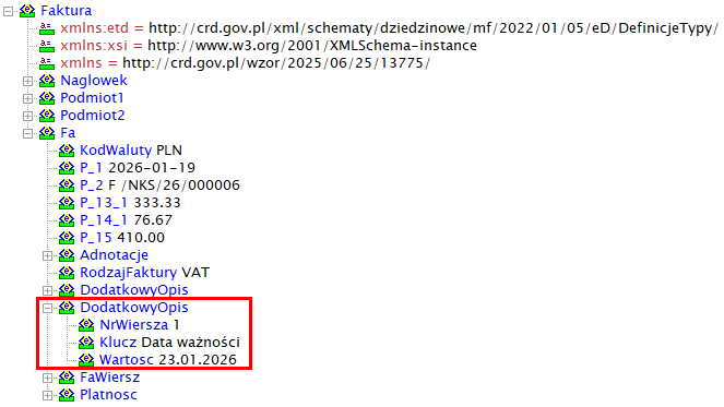 W efekcie, w wygenerowanym XML’u dla dokumentu F /NKS/26/000005 w węźle Fa znajduje się gałąź DodatkowyOpis zawierająca tagi: