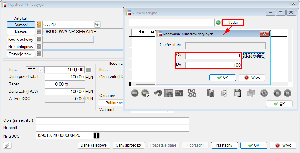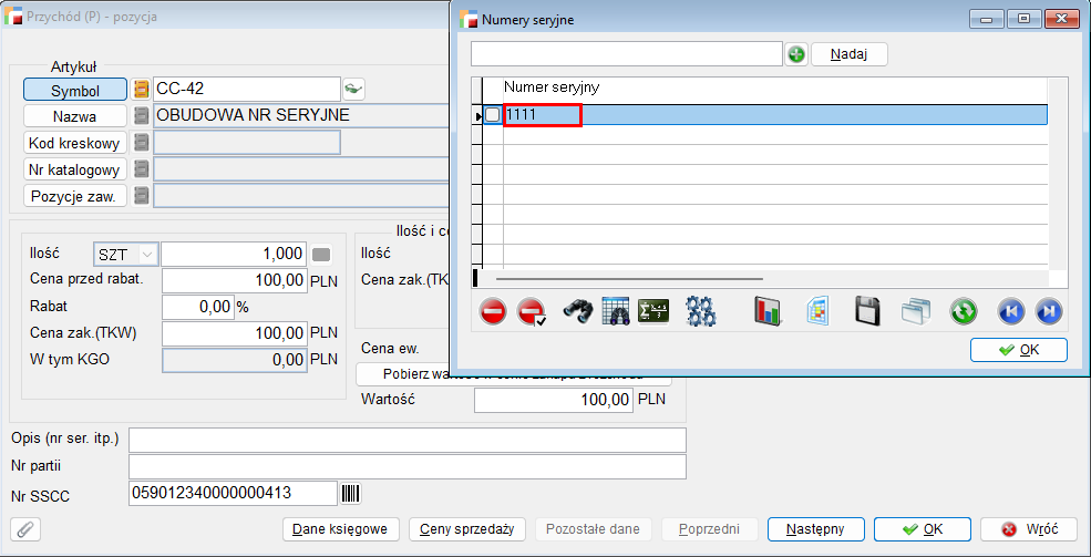 Artykuł CC-42 z włączoną obsługą numerów seryjnych przyjęto dokumentem przychodowym P /W /26/000003 w ilości 100 szt., nadając nr seryjne od 1 do 100 (całkowita dł. nr seryjnego 4 tj. maska 0000, a więc nr seryjne od 0001 do 0100).