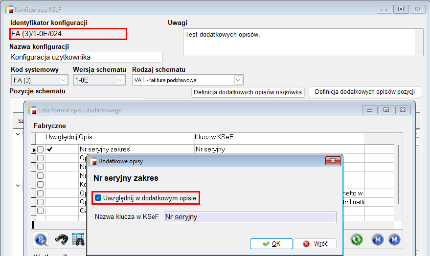 Wskazana konfiguracja posiada włączone uwzględnianie zakresu numerów seryjnych w dodatkowym opisie w Definicji dodatkowych opisów pozycji.