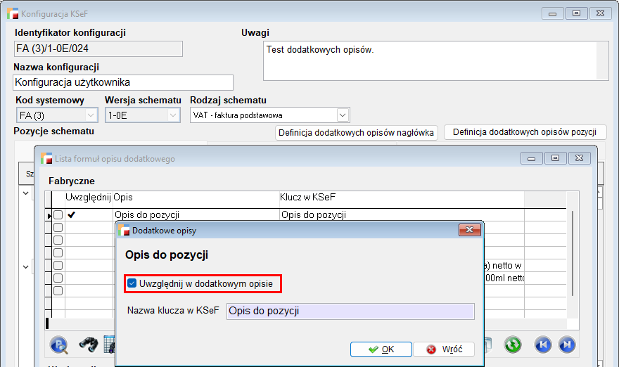 Wskazana konfiguracja posiada włączone uwzględnianie Opisu do pozycji w dodatkowym opisie w Definicji dodatkowych opisów pozycji.